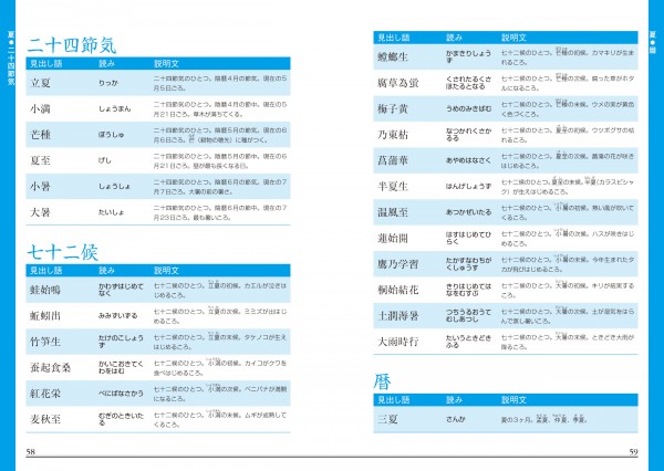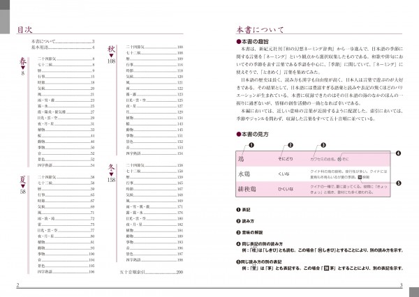 本編においては、近しい意味の言葉が近接するように配置した。索引においては、季節やジャンルを問わず、収録した言葉をすべて五十音順に並べている。